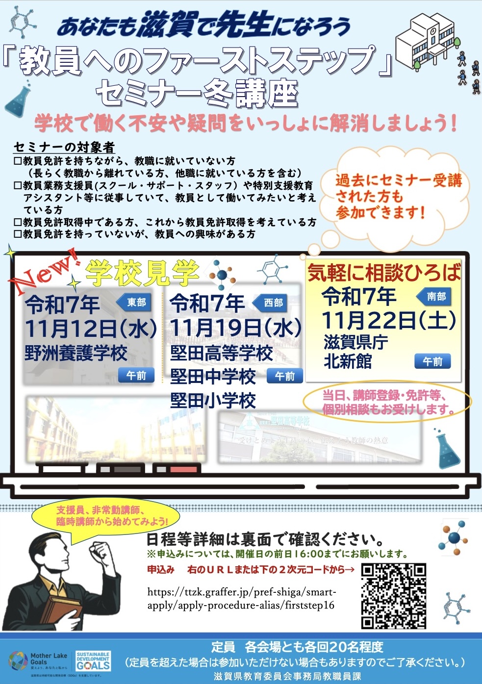 - 小学校、中学校、高等学校、特別支援学校のいずれかの教員免許状を所有していて、教育現場で働くことに興味を持っておられる方。教員免許取得を考えておられる方や教員に興味のある方。
