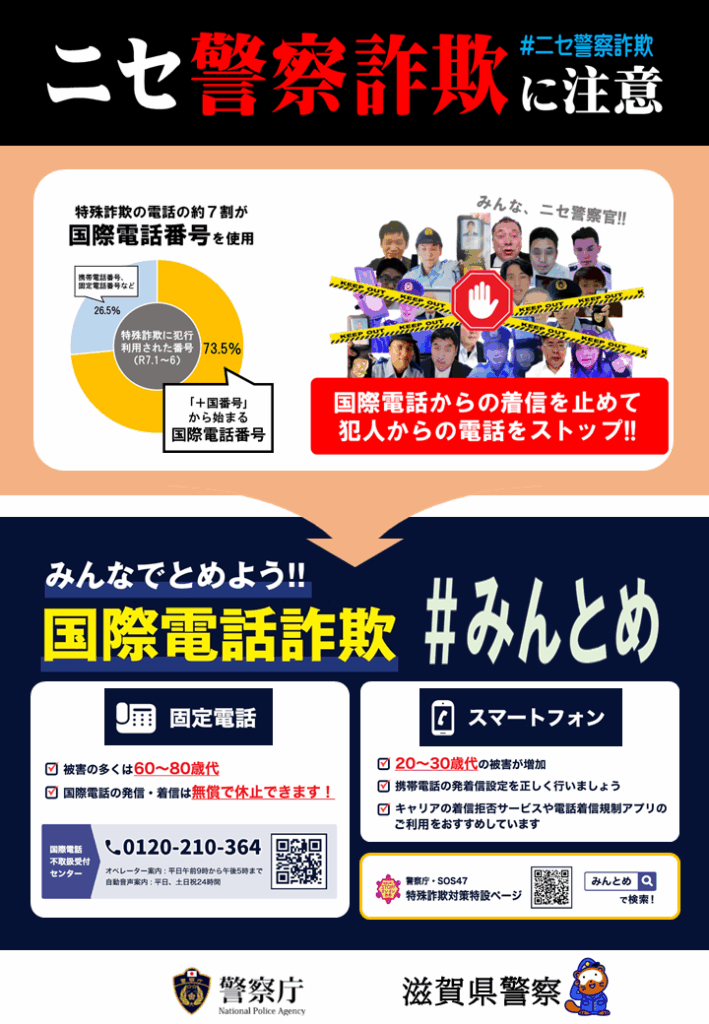 被害に遭わないために、国際電話番号を利用休止にするなどの電話対策や、県警の公式アプリ「ぽけっとポリス しが」などにより、最新の手口を知ることが大切です。