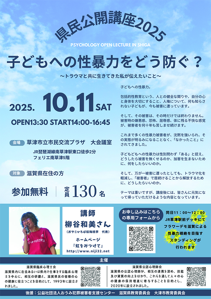 滋賀県臨床心理士会と滋賀県公認心理士会が県民公開講座2025を開催します。テーマは「子どもへの性暴力をどう防ぐ?~トラウマと共に生きてきた私が伝えたいこと」となっています。当日参加費は無料、当日参加も可能ですので、ぜひご参加ください。