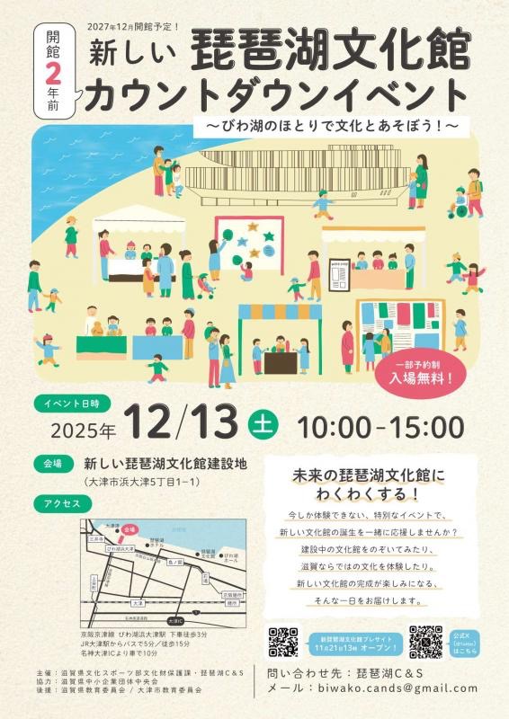 新しい琵琶湖文化館の開館2年前を記念したイベントが、2025年12月13日に建設地で開催!普段は入ることのできない建設現場の見学ツアー(要予約)や、滋賀県の文化と触れ合って遊べる楽しい体験コーナーなど盛りだくさん。未来の文化館に期待が高まる特別な一日を、ぜひお楽しみください。