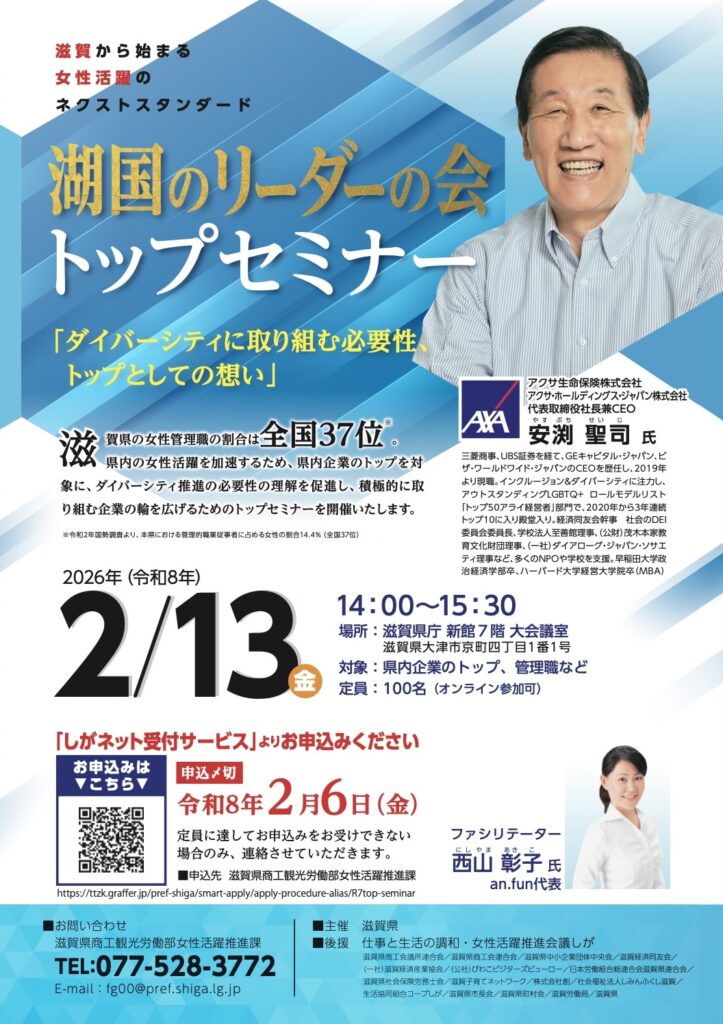 女性活躍推進の理解促進、それに取り組む企業の輪を広げることを目的とし、「湖国のリーダーの会トップセミナー」を開催します!