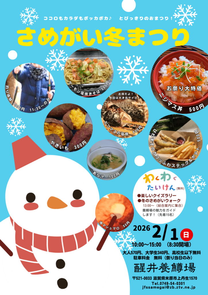 米原市に位置する醒井渓谷が冬の装いとなる時期に「さめがい冬まつり」を開催します。醒井渓谷の湧水は、年間を通じて12℃と一定であり、冬でもマスたちはエサをよく食べ、元気に泳いでいます。