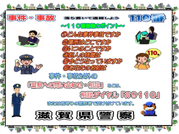 1月10日は「110番の日」です。事件や事故で緊急通報の110番をかけると警察本部のセンターに繋がります。順番に質問しますので、慌てずに答えてください。緊急通報以外の警察への問い合わせや相談等は「♯9110」または最寄りの警察署で受け付けています。