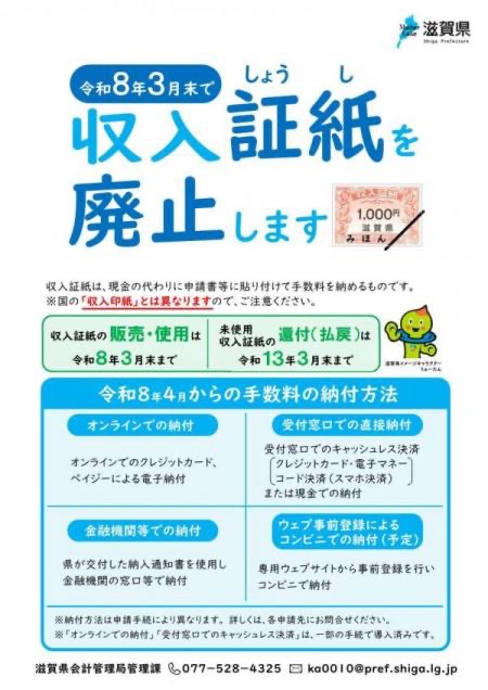 滋賀県収入証紙が使用できなくなります。未使用の収入証紙の還付方法や廃止後の支払方法の詳細はホームページをご確認ください。
