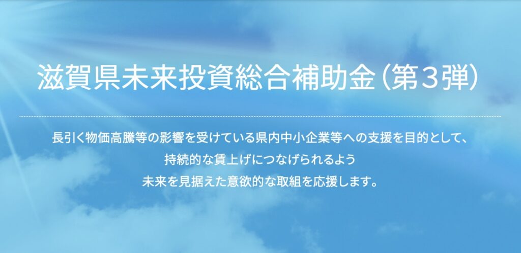 長引く物価高騰など厳しい状況にある中小企業等が持続的な賃上げにつなげられるよう、賃上げの原資となる付加価値額の増加を図ることを目的に「滋賀県未来投資総合補助金(第3弾)」を実施します。3月2日(月)からの一次募集開始に先立ち、ホームページにて詳細を公開しています。