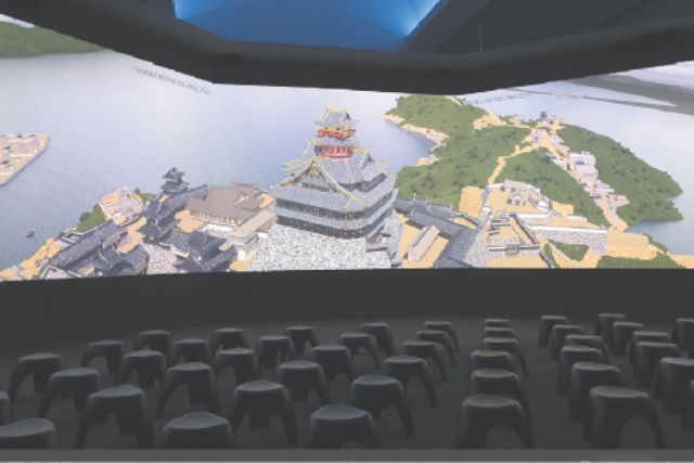 安土城天主と同じ八角形の平面に多面スクリーンを用いた、唯一無二の映像空間。織田信長が宣教師ヴァリニャーノに語るドラマ仕立ての「織田信長と安土城」などここだけの映像をお楽しみいただけます。