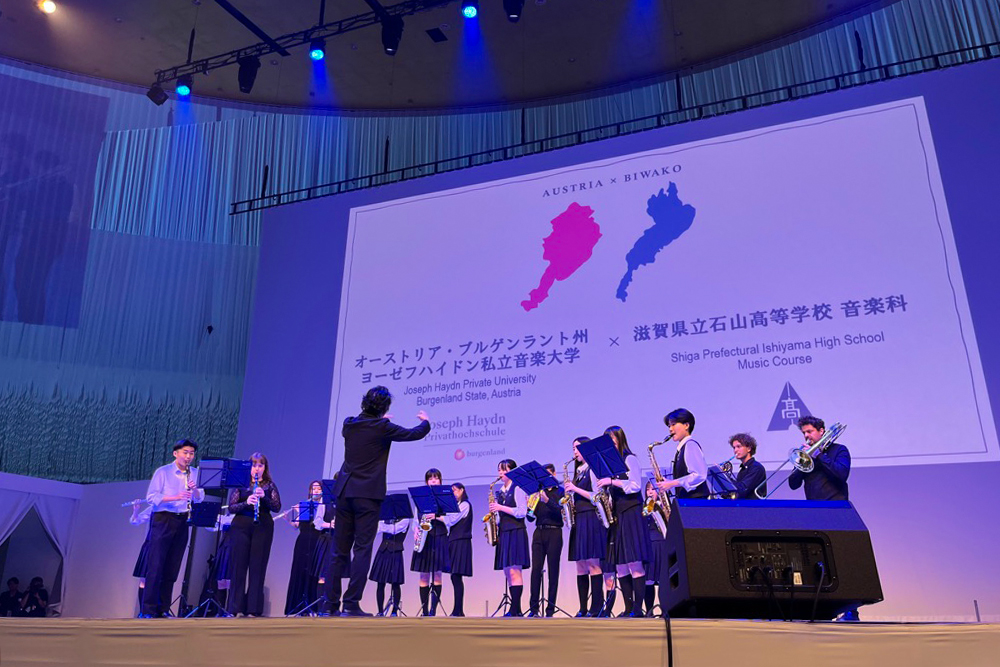 国の形と琵琶湖の形が瓜二つというSNS投稿をきっかけに、滋賀県はオーストリア・ブルゲンラント州と交流を進めています。万博会場では「滋賀県デイ~びわ湖サマークルーズ~」にて、ヨーゼフハイドン私立音楽大学と石山高校による共同演奏が実現。