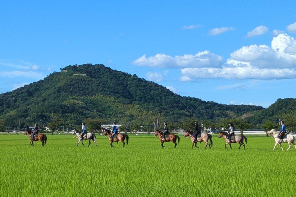賀茂神社の馬場を拠点に、日本在来馬の保存と普及に取り組む「御猟野乃杜牧場」では、希少な在来馬に乗って、流鏑馬や和式乗馬が体験できます。琵琶湖の砂浜や湖岸の神社、田んぼの真ん中に伸びる道など、滋賀の自然を満喫できる「琵琶湖外乗(そとのり)」も人気。