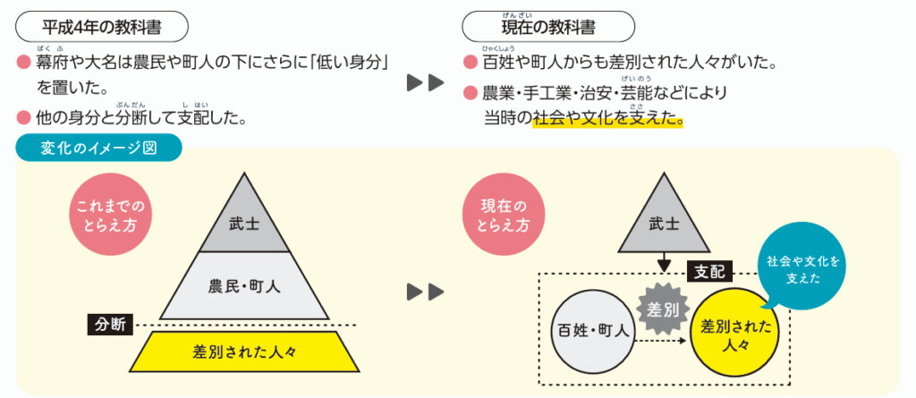 小学校の教科書における部落差別(同和問題)に関する歴史の記述は、時代とともに変化しています。