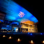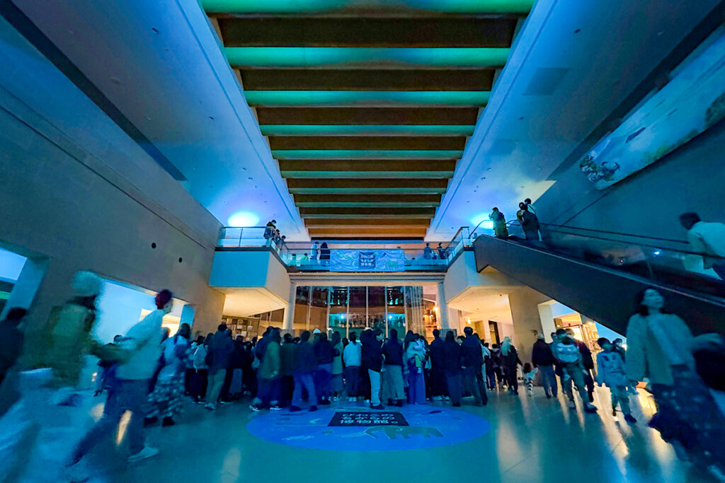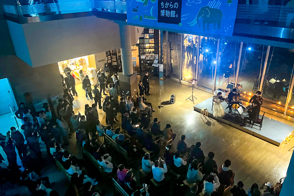 館内に入るとまず青い光に包まれたアトリウムが出迎えてくれました。大きな窓の向こうに広がる夜空とあいまって、まるで別世界のような幻想的な空間。弦楽四重奏「カルテット風雅」によるコンサートも行われ、やさしい弦の音色と光の演出に、みなうっとりとたたずんでいました。