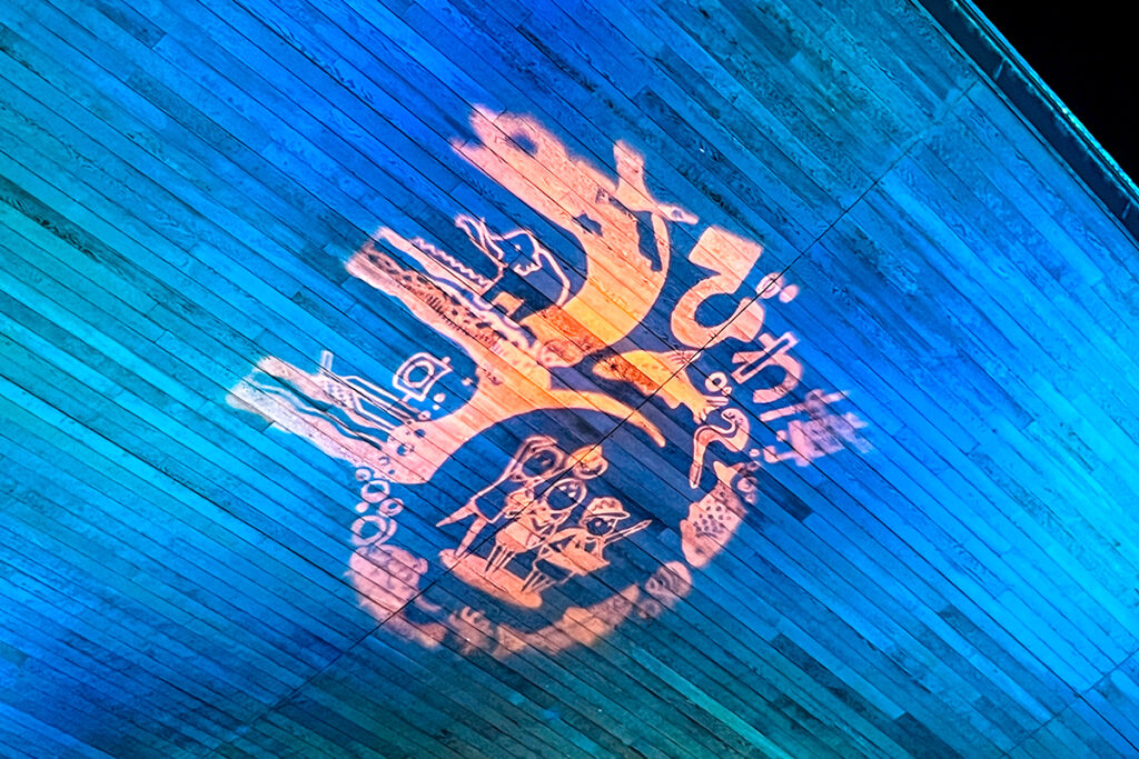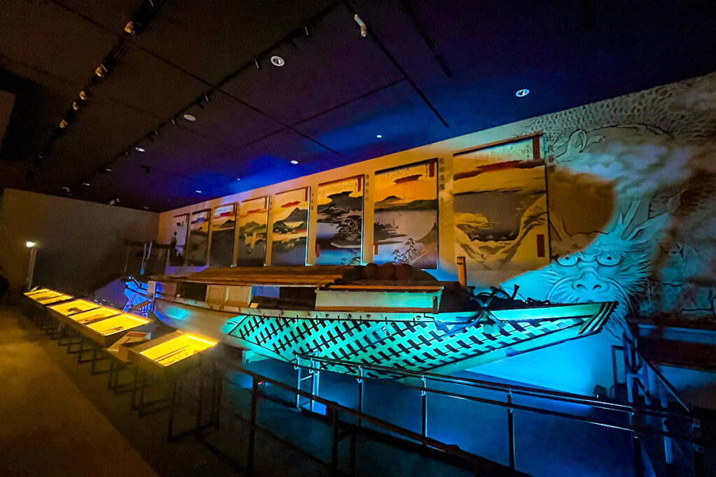 展示室では、中世から琵琶湖の舟運を支えてきた「丸子船」も特別にライトアップ。ゆらめく光の中に浮かび上がる姿は、今にも夜の琵琶湖へ漕ぎ出していきそうな大迫力です。多くの人が足を止め、写真を撮りながらその幻想的な光景を楽しんでいました。