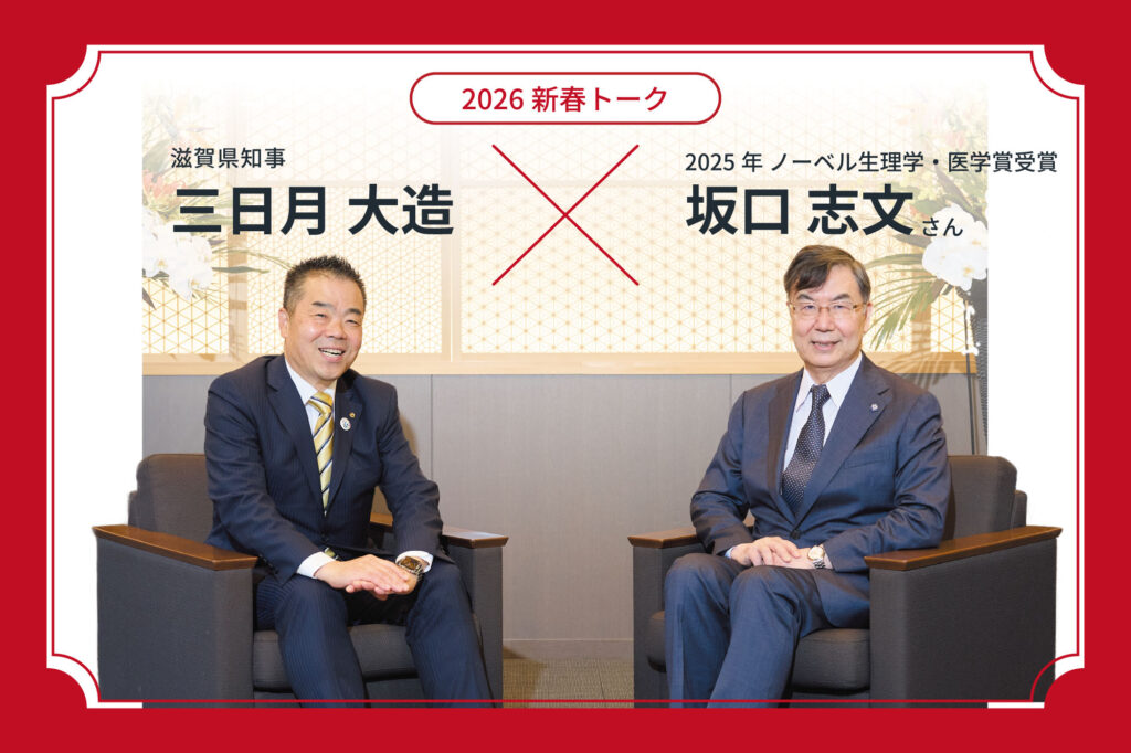 滋賀県出身者として初のノーベル生理学・医学賞を受賞された坂口志文さん。三日月知事とともに、故郷への想い、そして学びや健康の未来について語っていただきました。